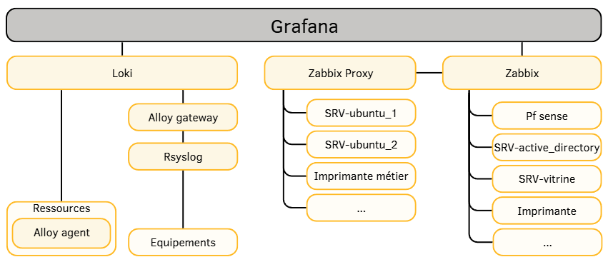 - Architecture de supervision centralisée collectant les logs et événements de tous les équipements